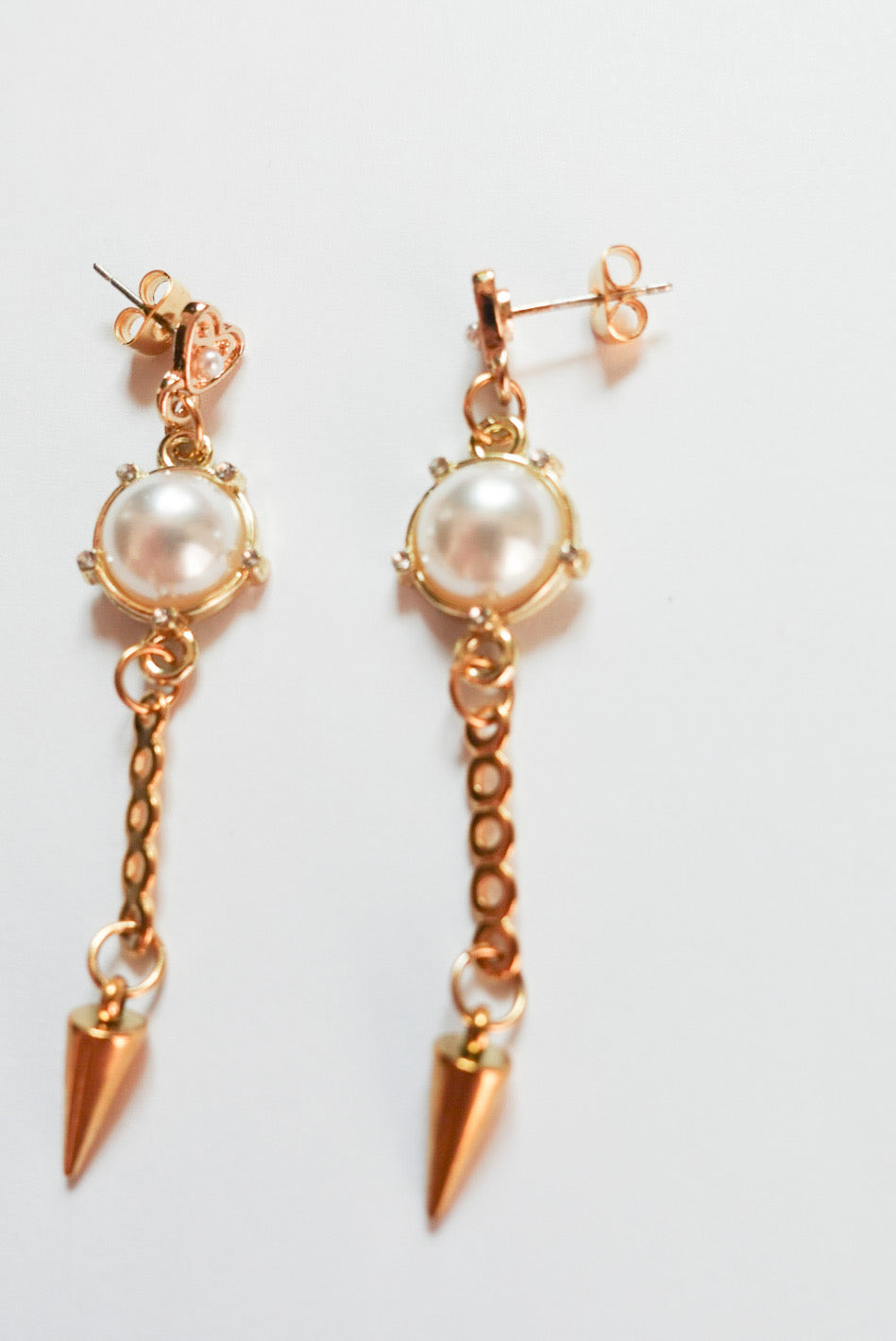 クラシカルな大粒パールと、チェーンの先で揺れるスパイクモチーフが絶妙に融合したピアス。
