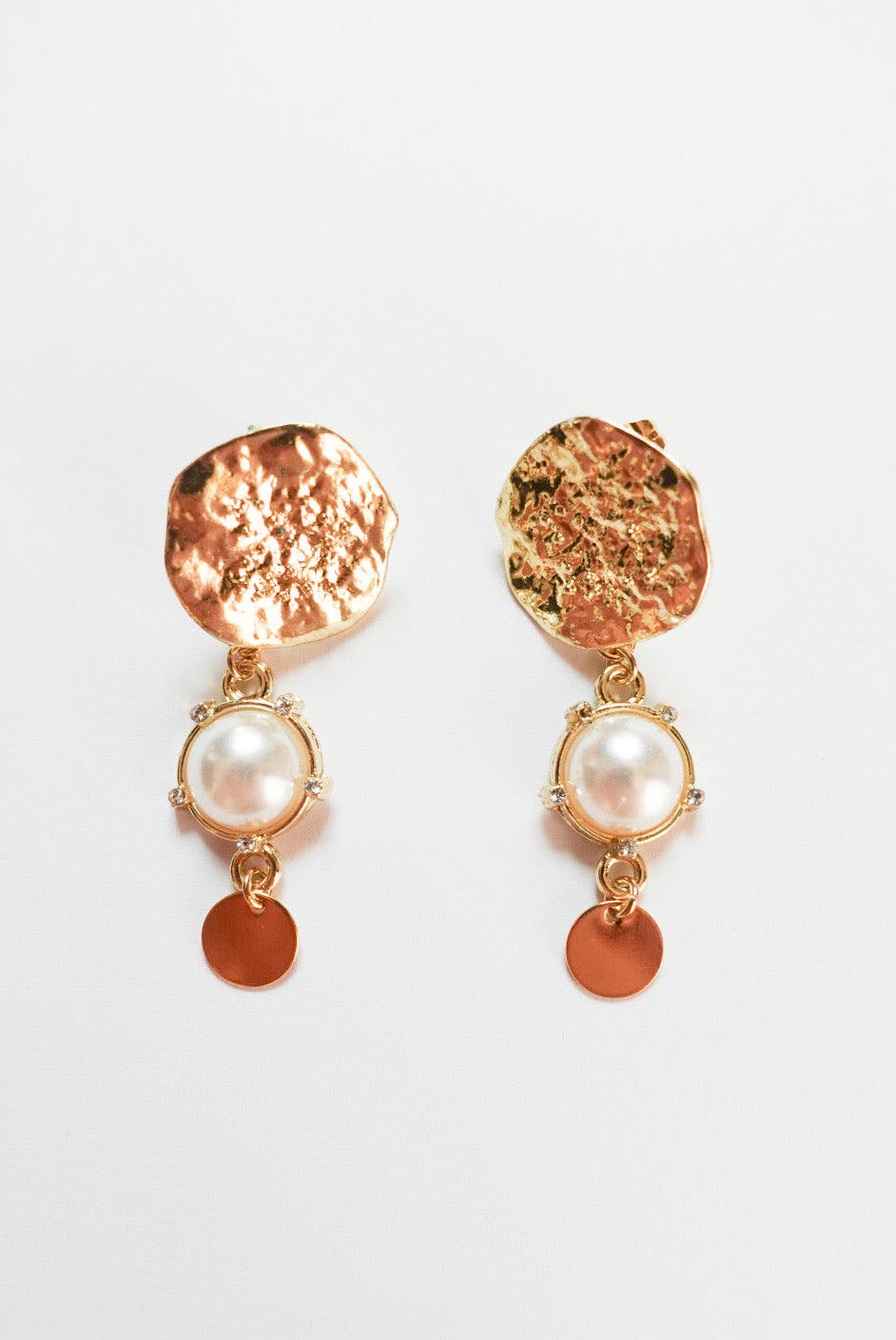ハンマリング加工が施されたゴールドプレートは、光を受けるたびに表情豊かに輝き、アートのような質感を楽しめます。中央に配された艶やかなパールが上品さを添え、揺れるゴールドチャームが動きに合わせて軽やかなアクセントをプラス。