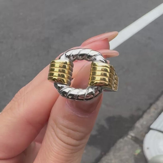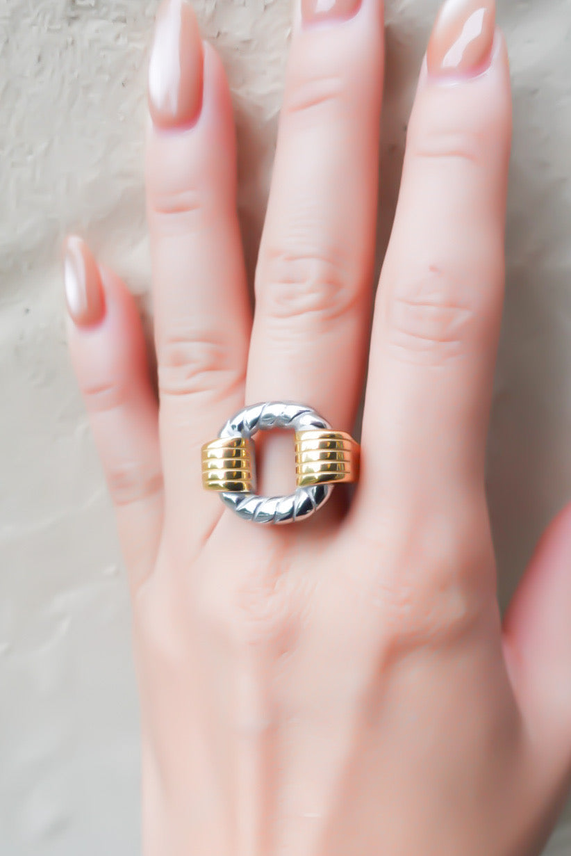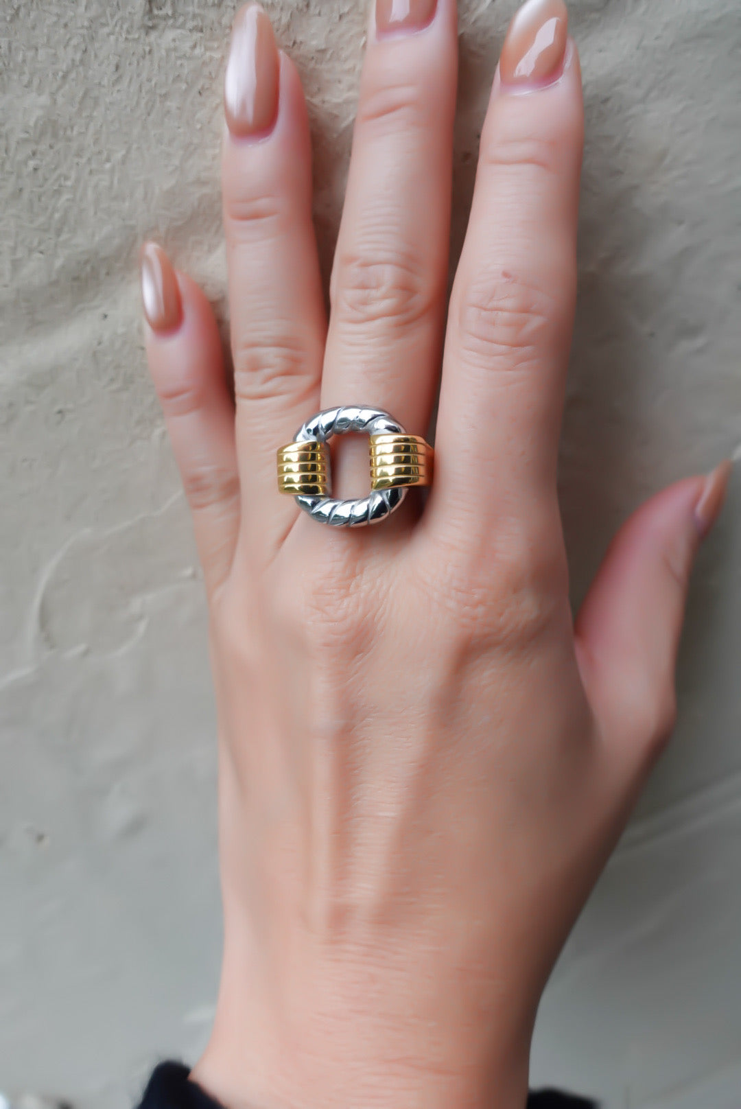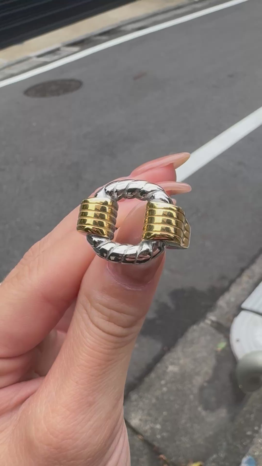 幾何学的なサークルにゴールド×シルバーの配色が映える、近未来感あふれるリング。