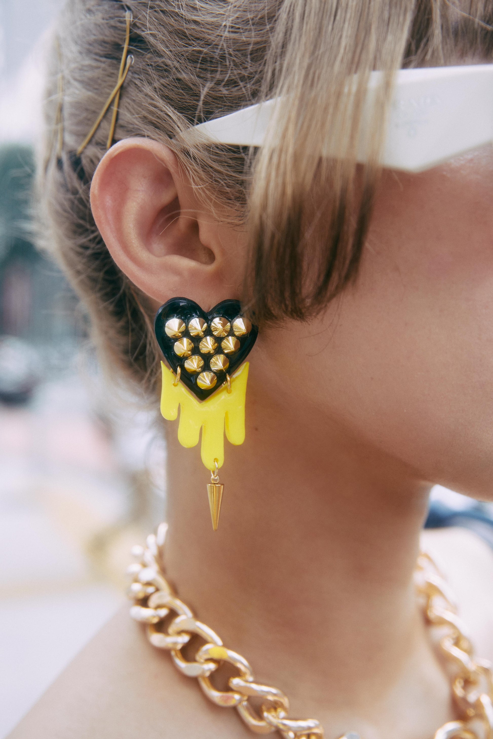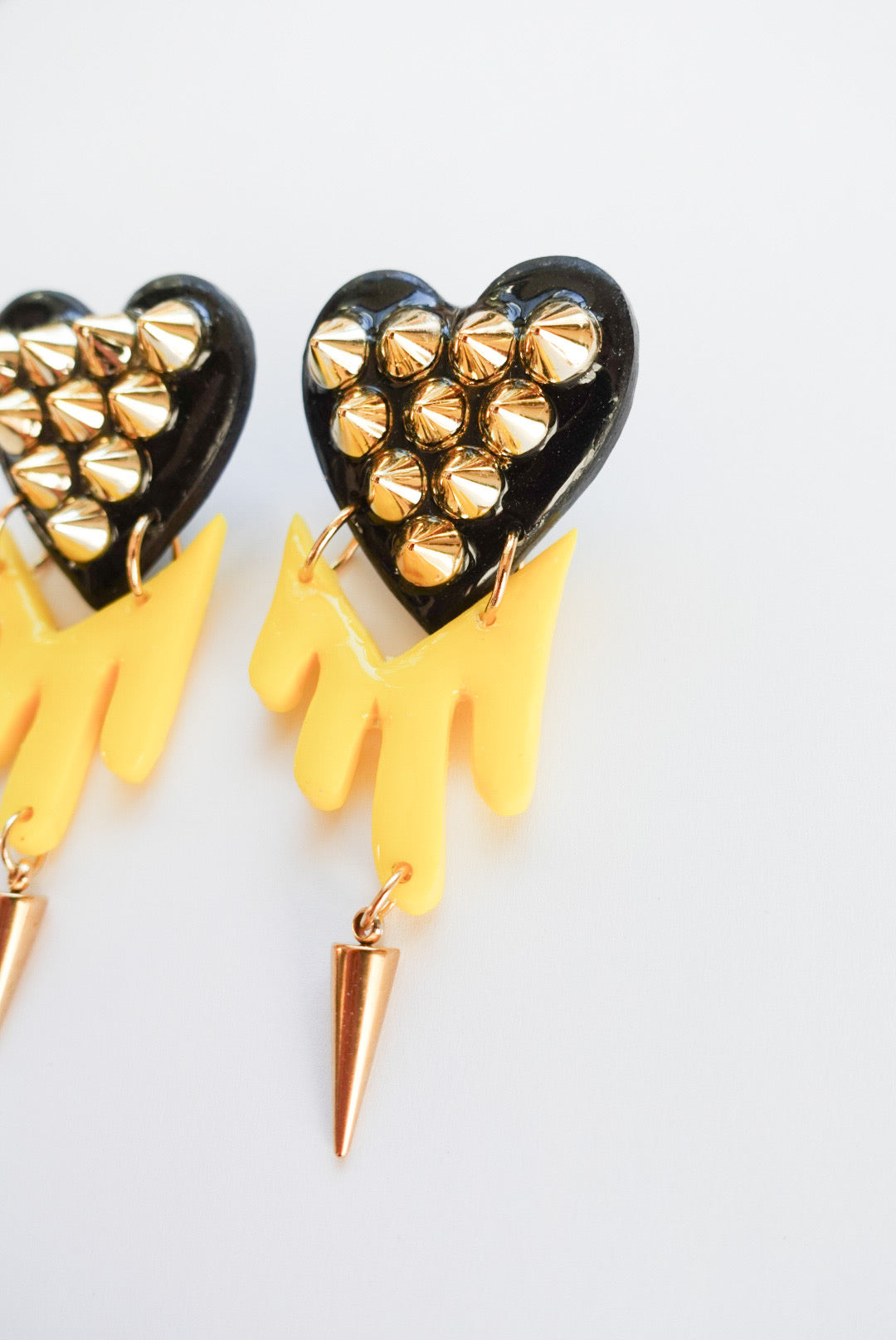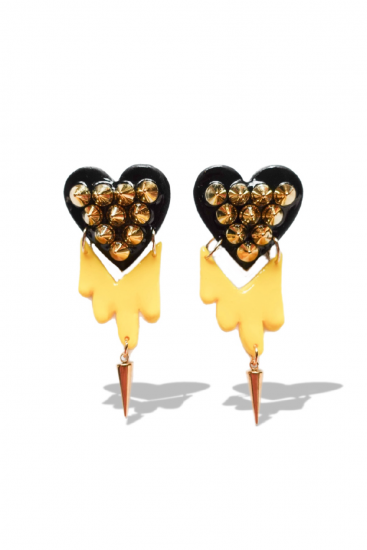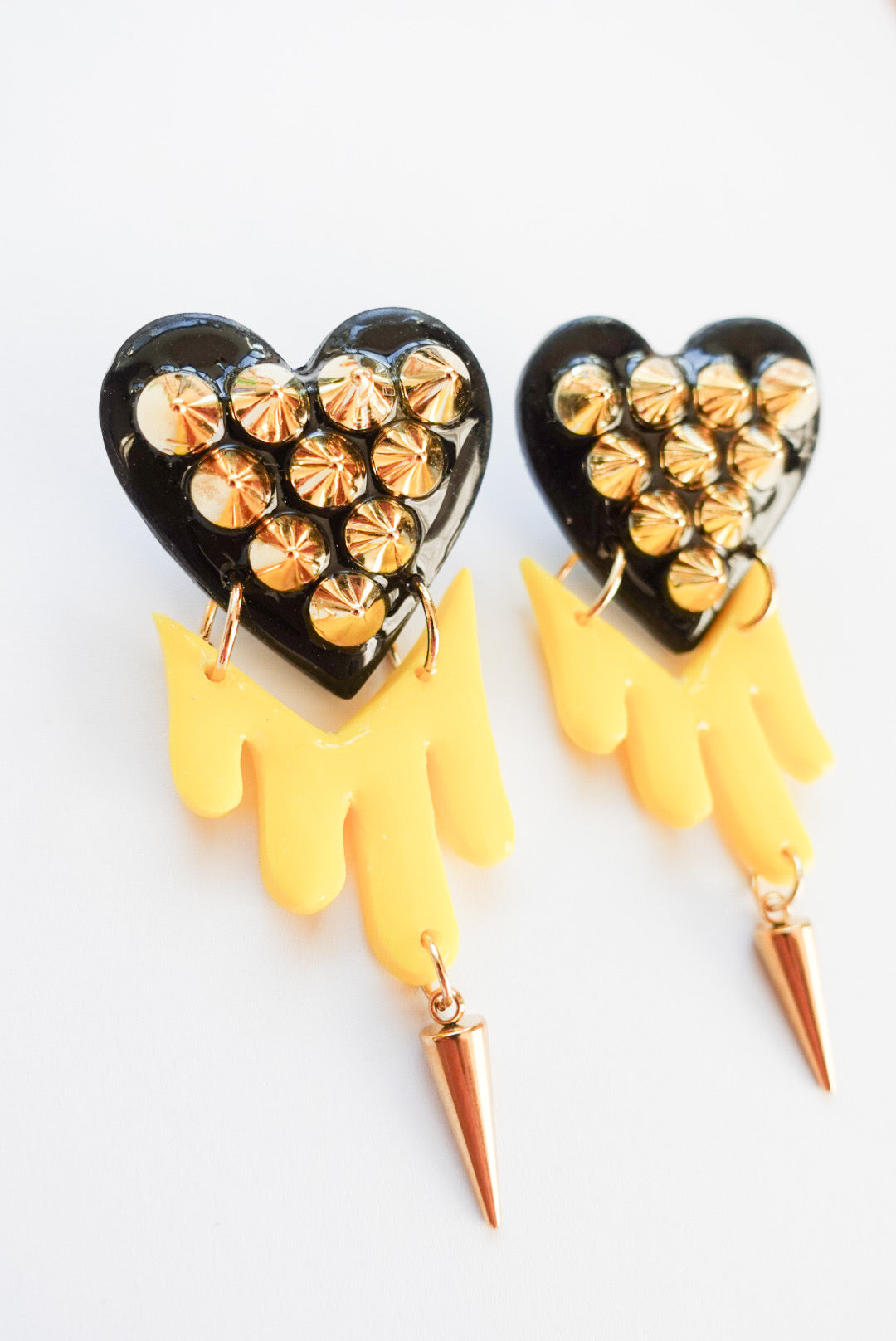ブラックハートにぎっしり詰まったゴールドスタッズ、そこからとろけるように滴るネオンイエローのドリップ。