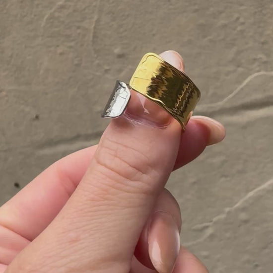 ゴールドとシルバー、相反する2つの表情を一つの指先に纏う、ユニークなデザインのステンレスリング。