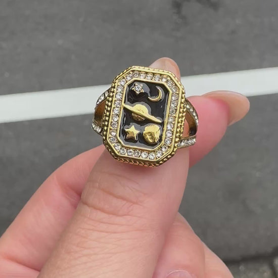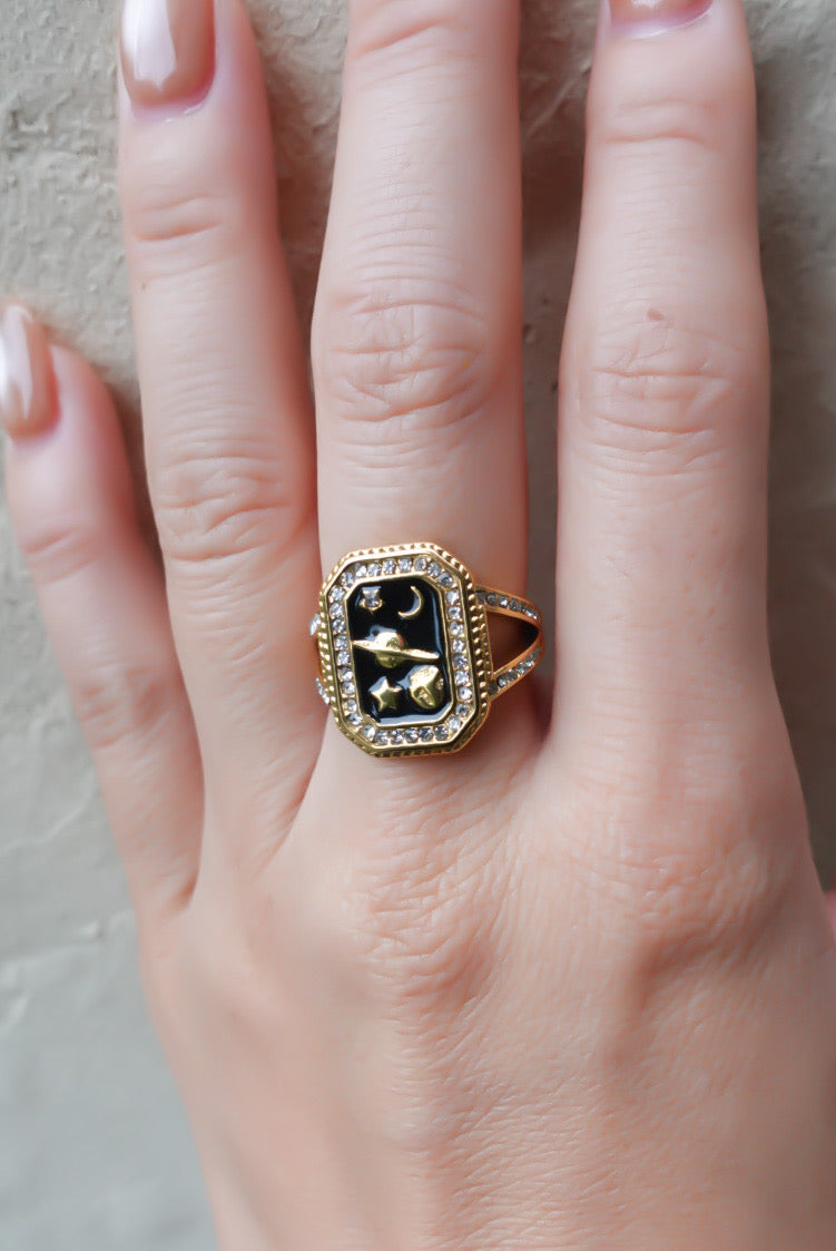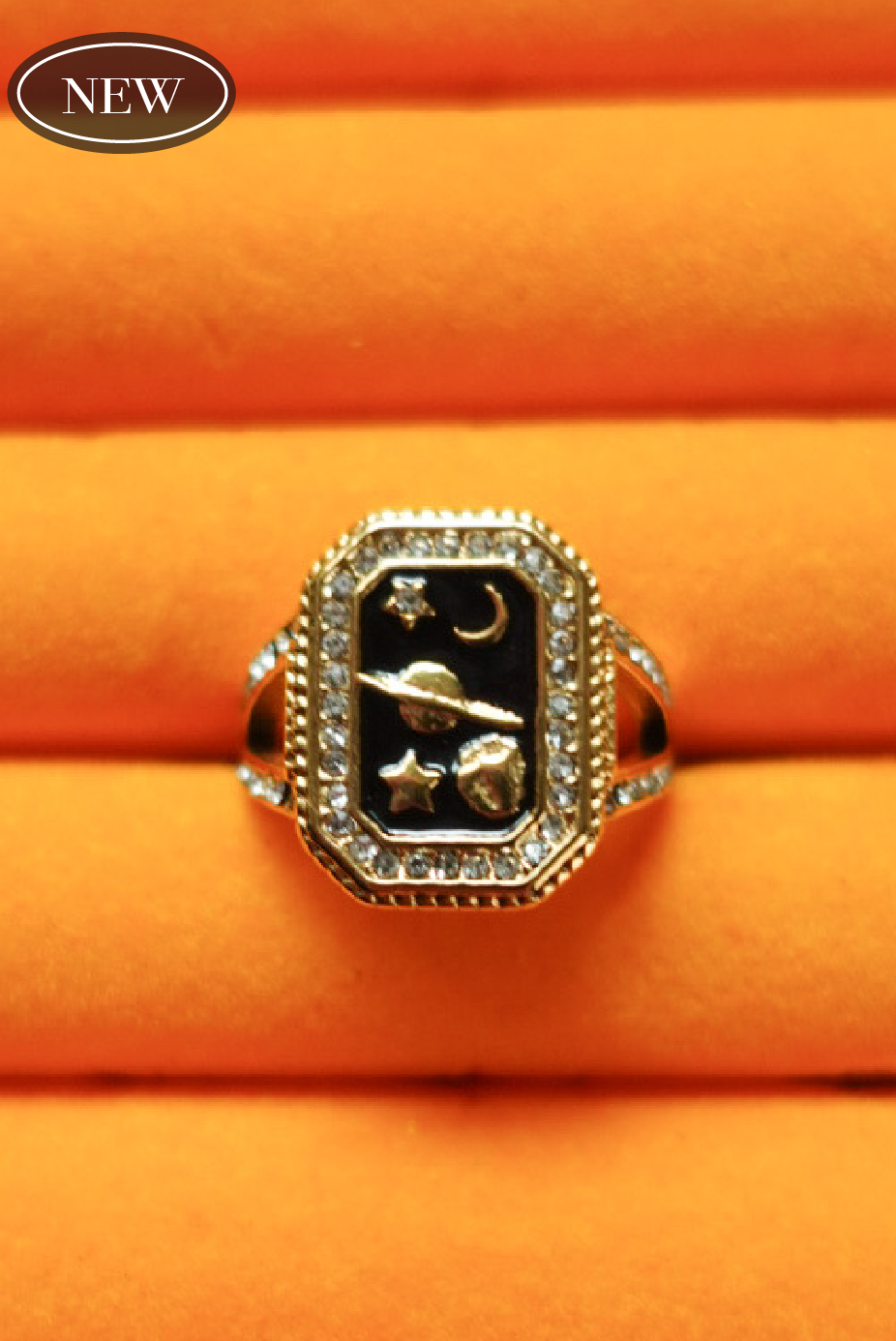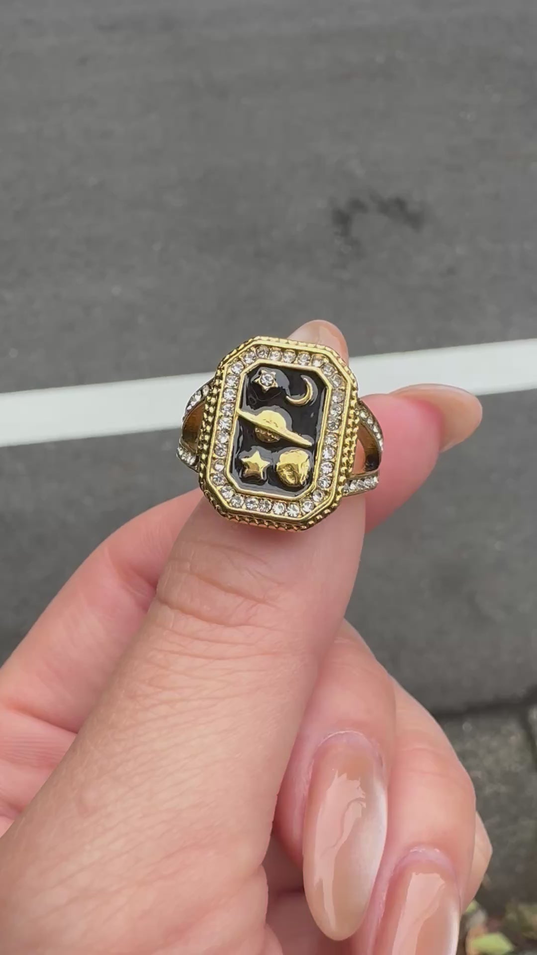 惑星、月、星たちが夜空を自由に漂うような、幻想的な世界を封じ込めたステートメントリング。