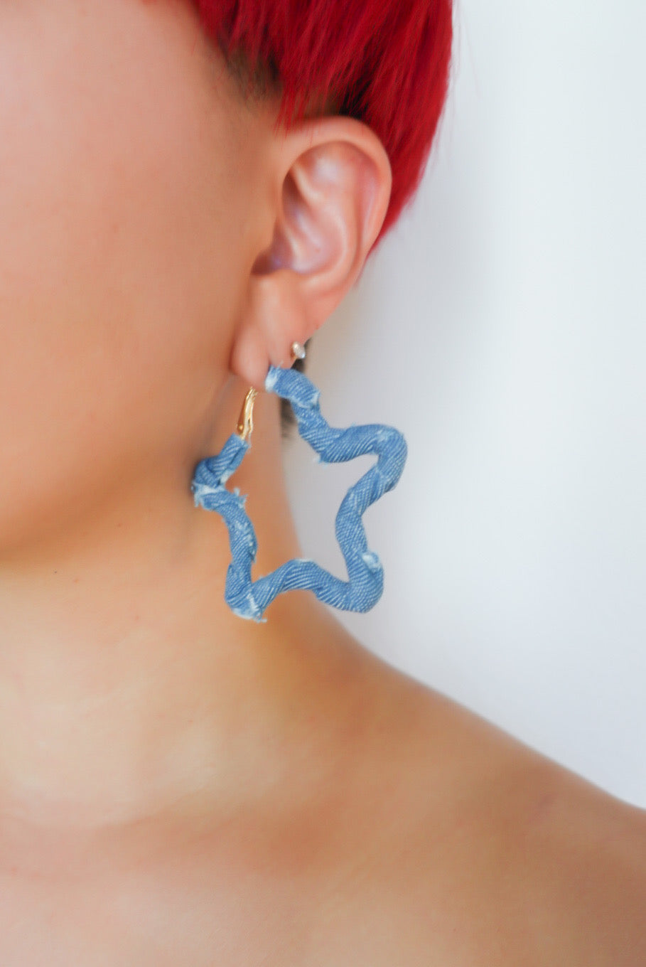 デニム素材でかたどられた星モチーフが、耳元で軽やかに揺れる主役級アイテム。