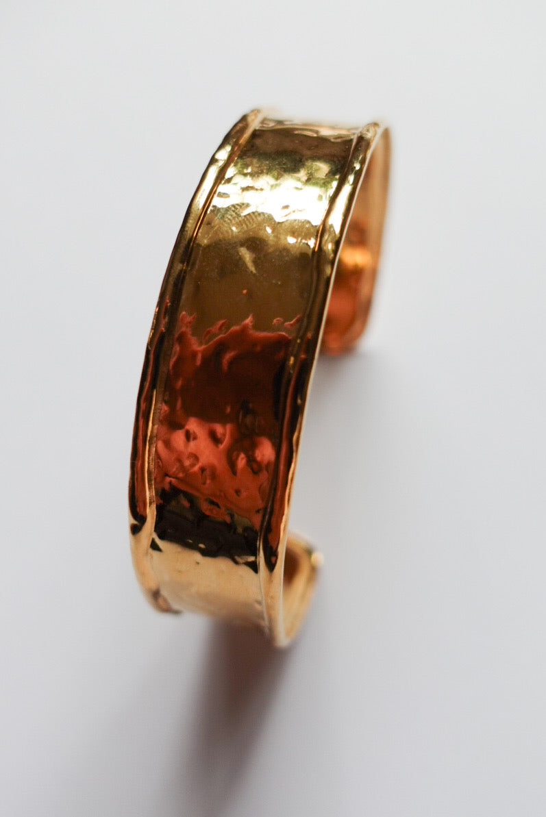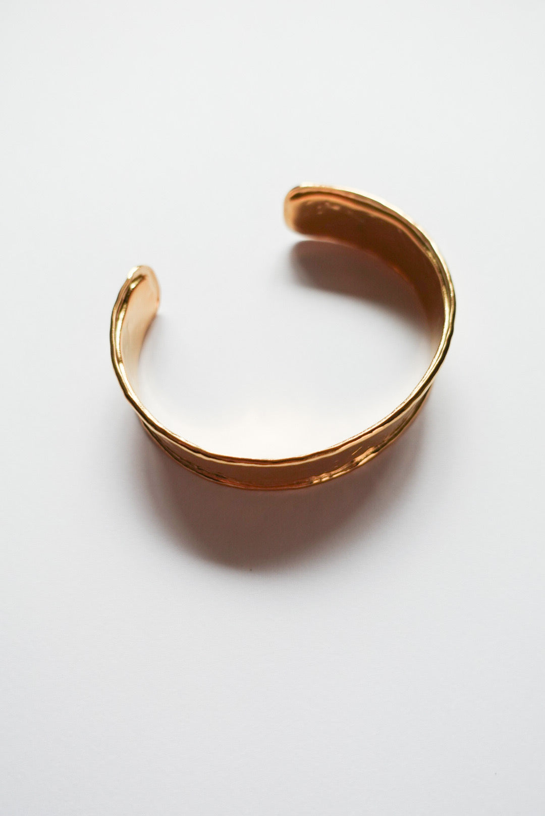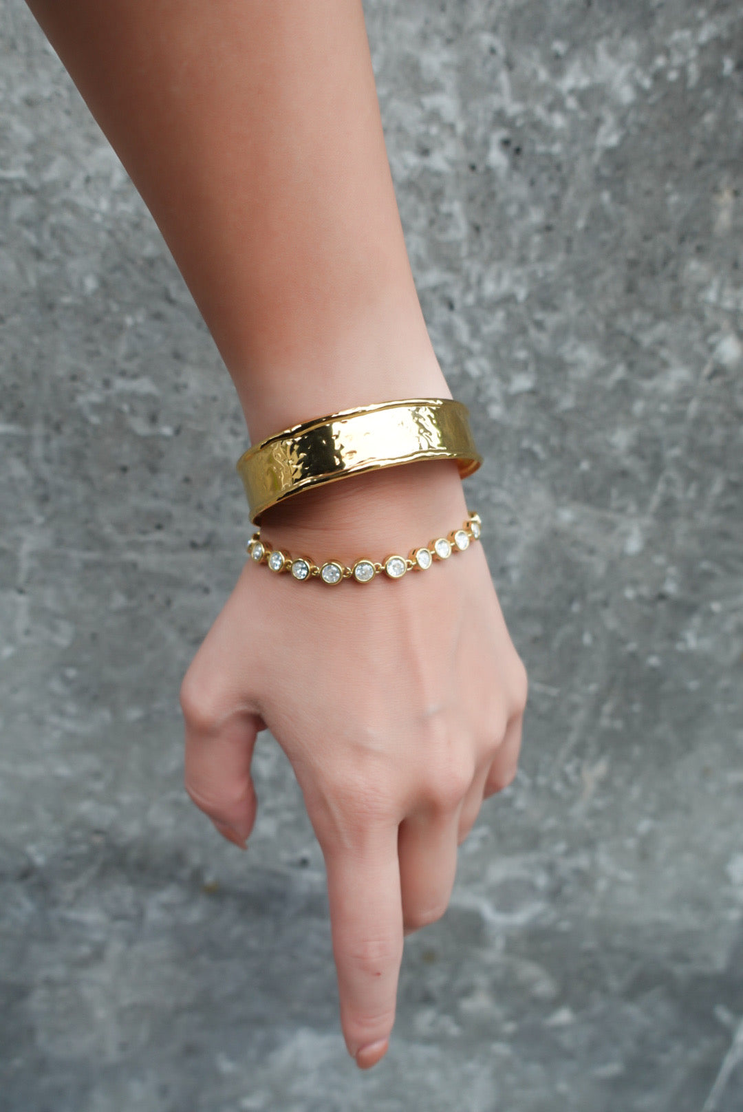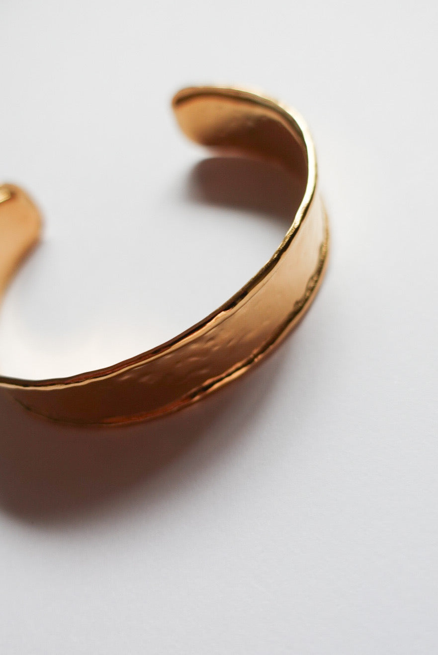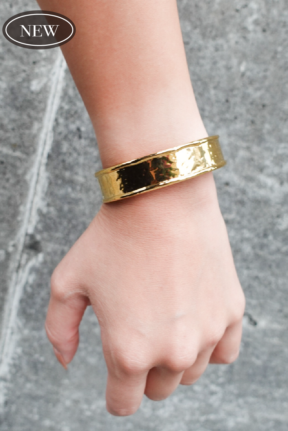 艶やかなゴールドのステンレス素材に、ハンマー仕上げ風のディテールを施した幅広デザインが、シンプルでありながら圧倒的な存在感を放つバングル。無骨さと上品さが同居するこの一本は、コーディネートにエッジを加えたい時や、モードな装いにぴったりです。