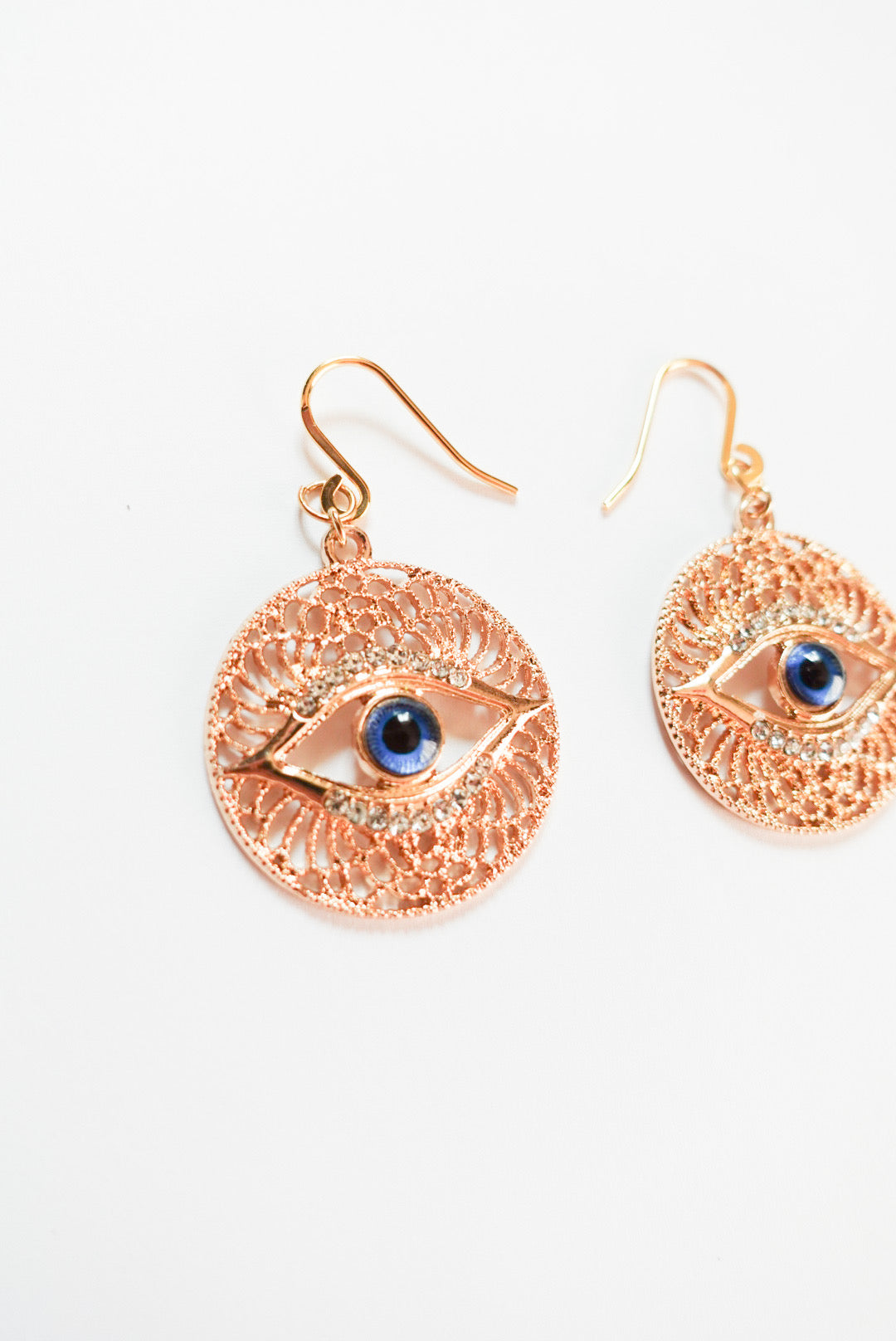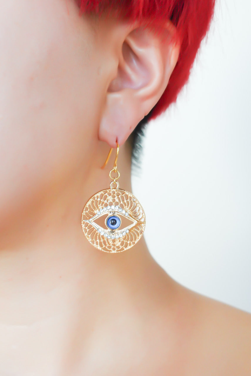 精巧な透かし模様のゴールドフレームの中央に、鮮やかなブルーのアイモチーフを配置しました。揺れるたびにきらめくストーンが、視線を集めてくれるデザインです。