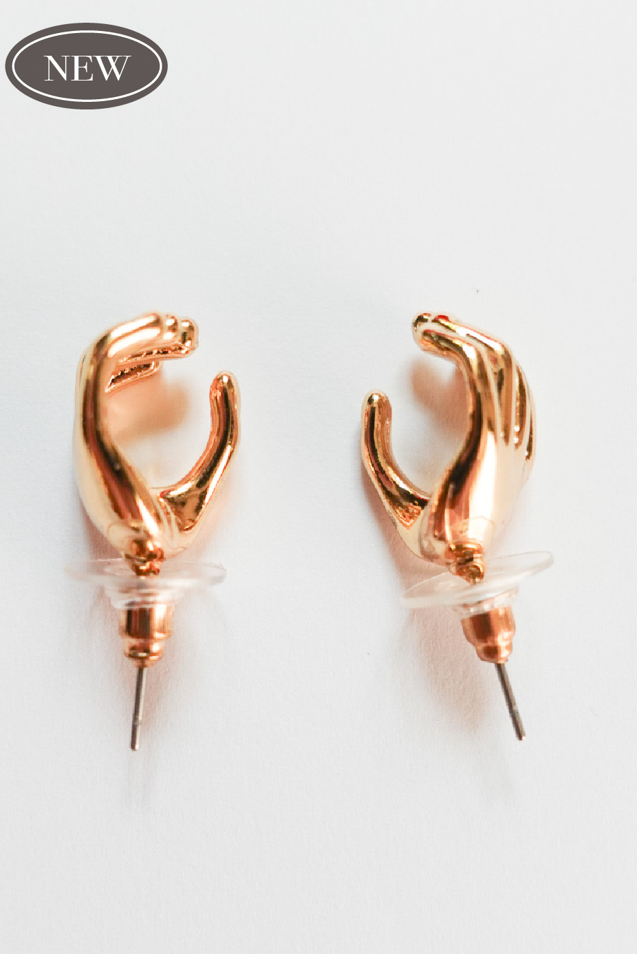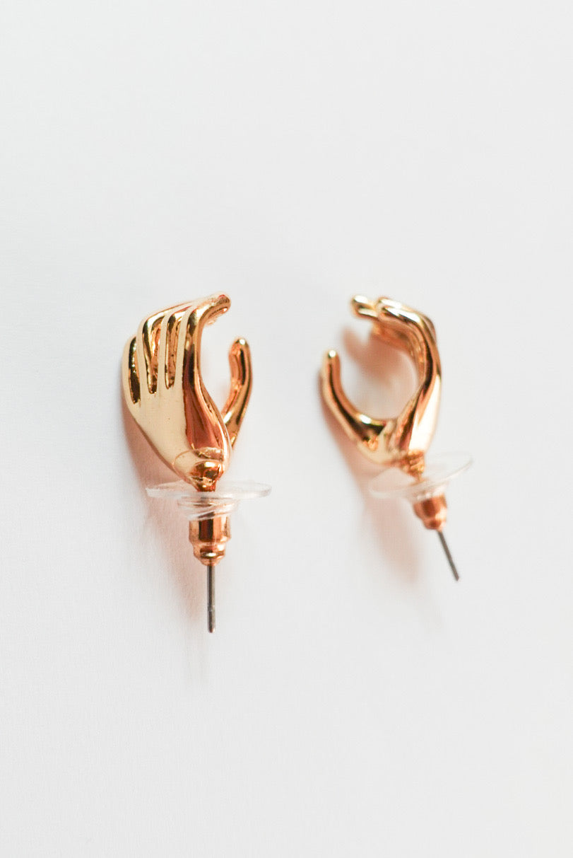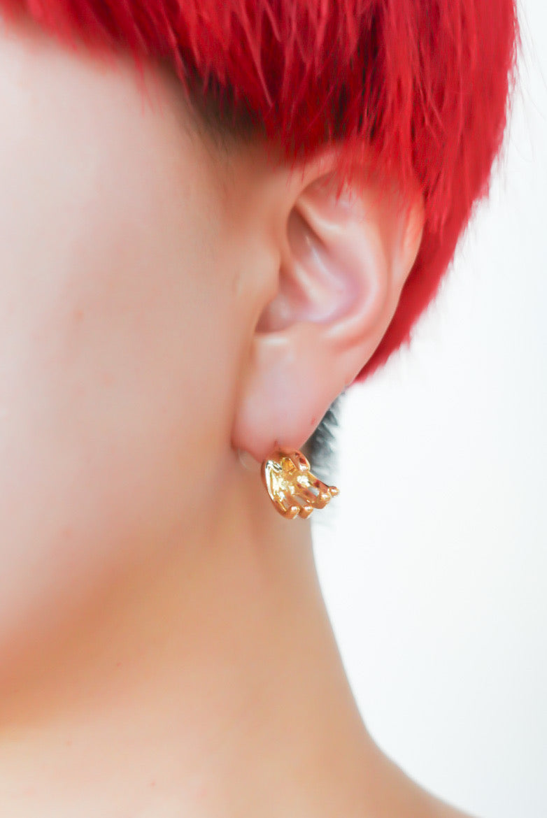 手元をそのまま切り取ったような、遊び心あふれるデザインの「ゴールドハンドピアス」。