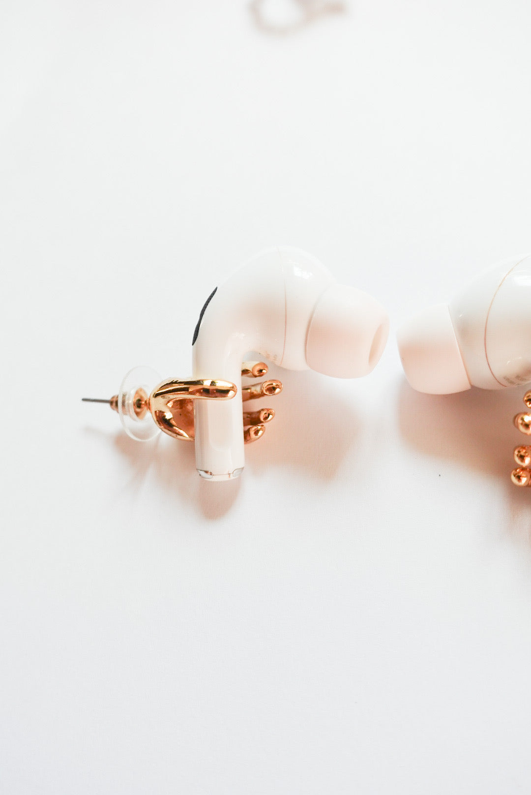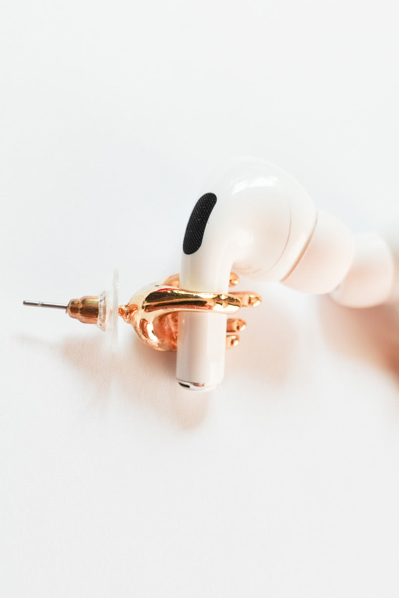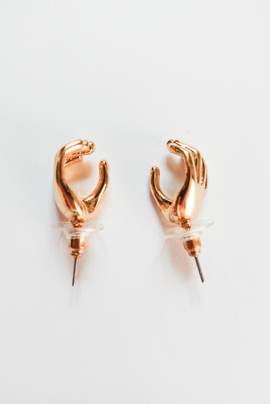 手元をそのまま切り取ったような、遊び心あふれるデザインの「ゴールドハンドピアス」。