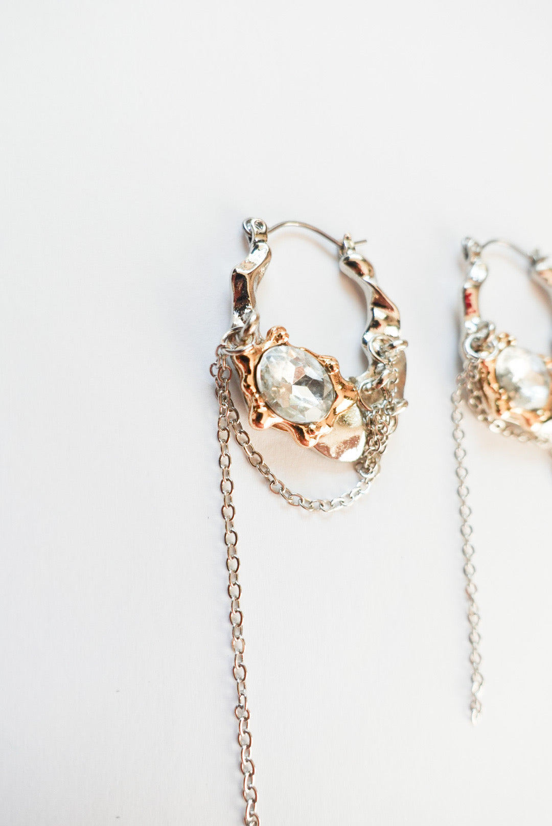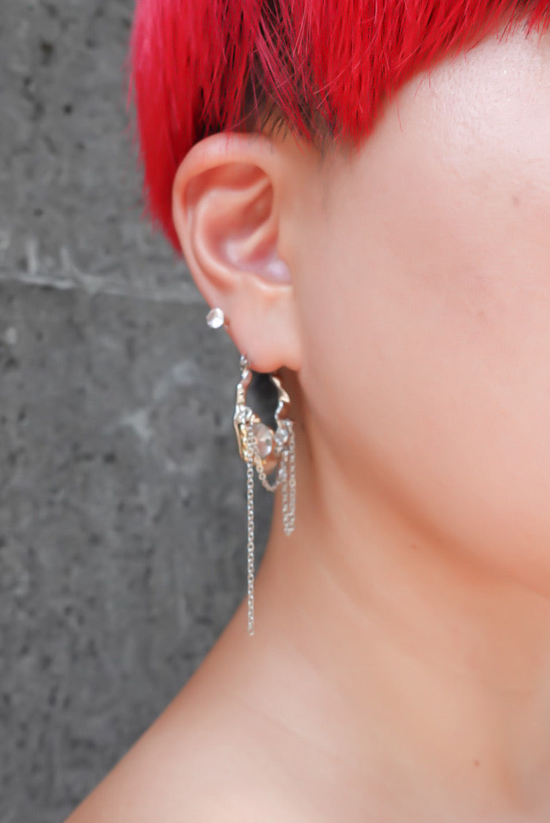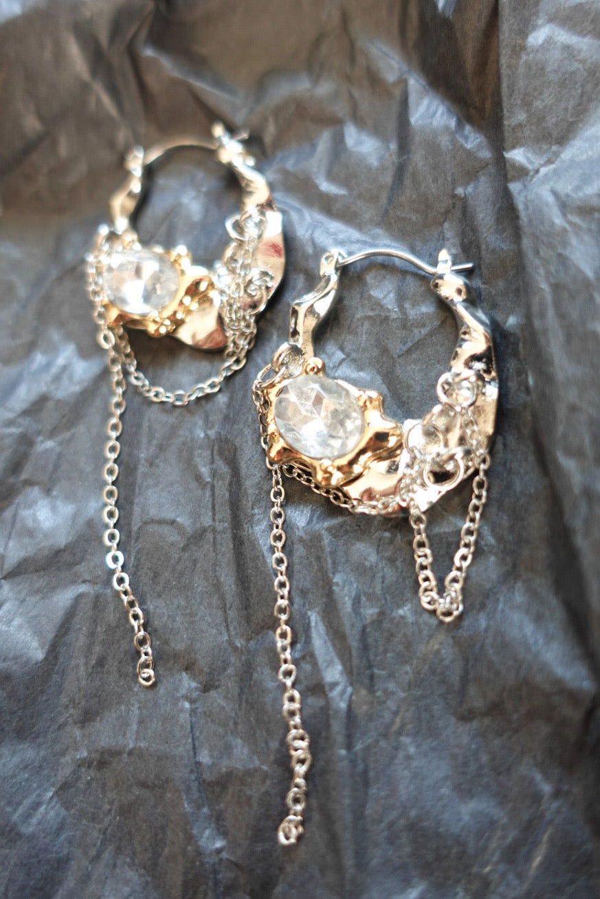 光沢のあるメタルパーツに、ゴールドとシルバーのニュアンスが交差する立体的なデザイン。中央には存在感たっぷりのカットストーンをあしらい、繊細なチェーンが揺れるたびに、視線を惹きつけるドラマティックな印象を与えます。