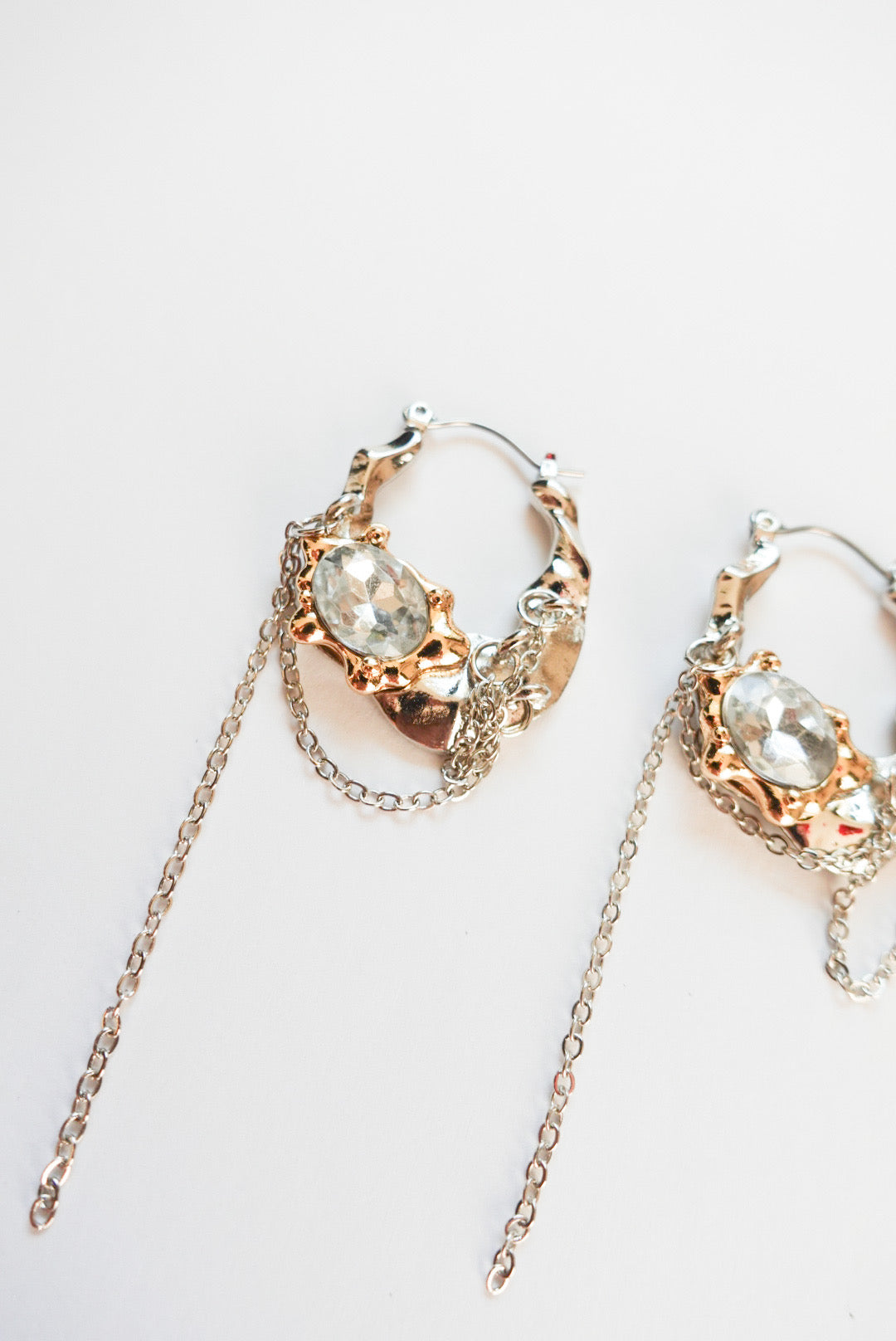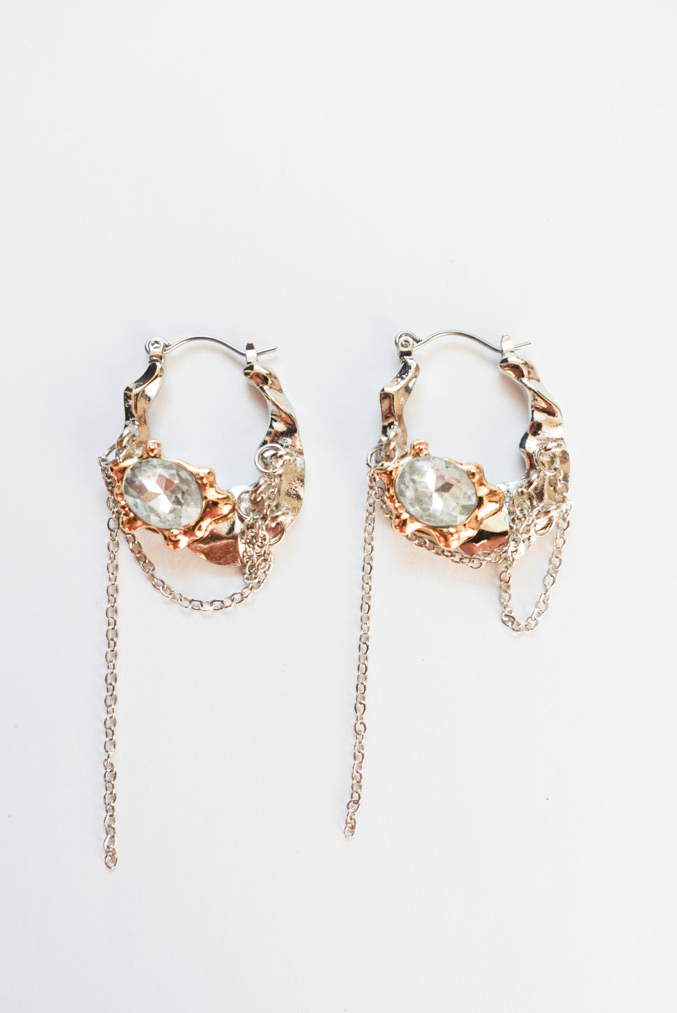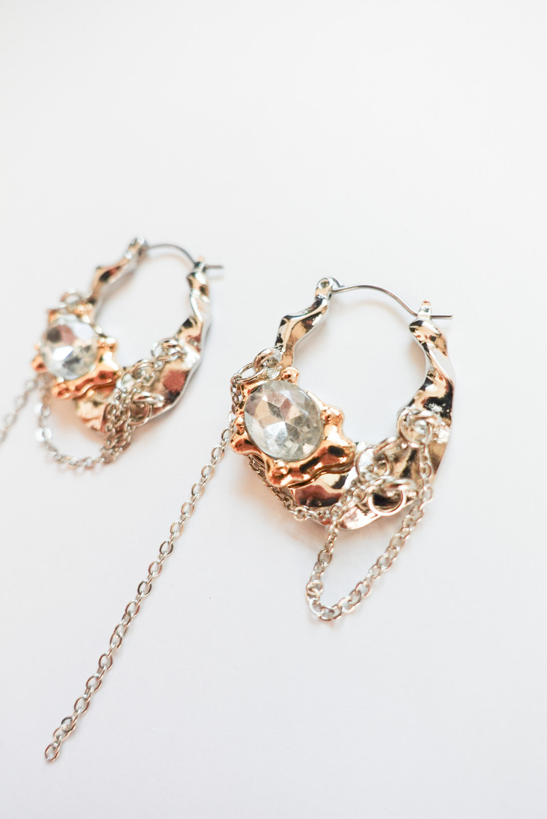 光沢のあるメタルパーツに、ゴールドとシルバーのニュアンスが交差する立体的なデザイン。中央には存在感たっぷりのカットストーンをあしらい、繊細なチェーンが揺れるたびに、視線を惹きつけるドラマティックな印象を与えます。
