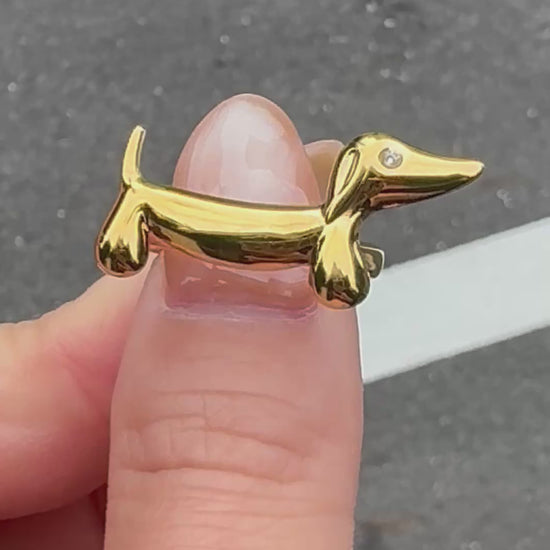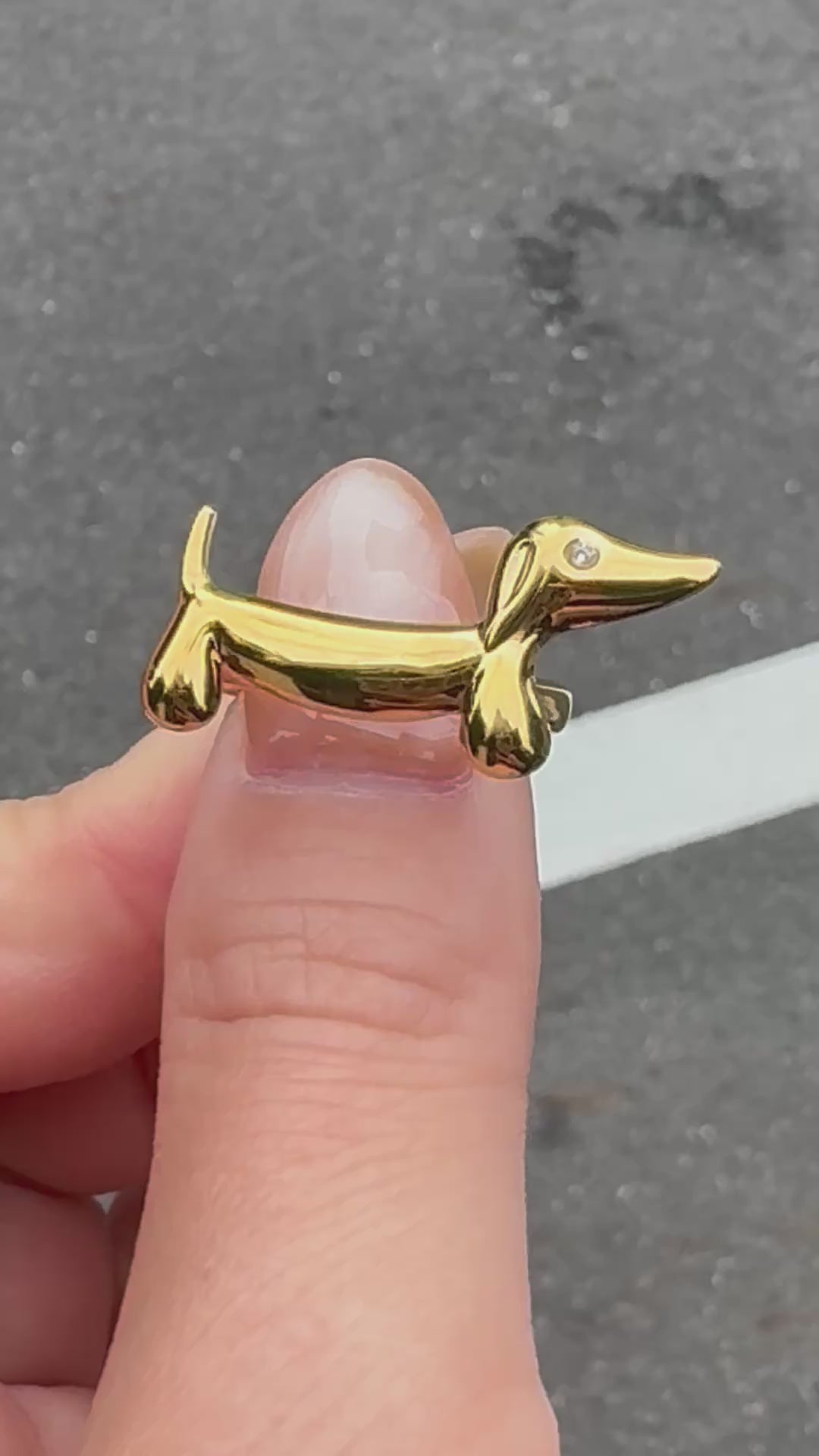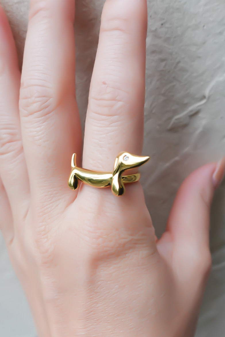光沢感のあるゴールドカラーが目を引く、ダックスフンドモチーフのステンレスリング。